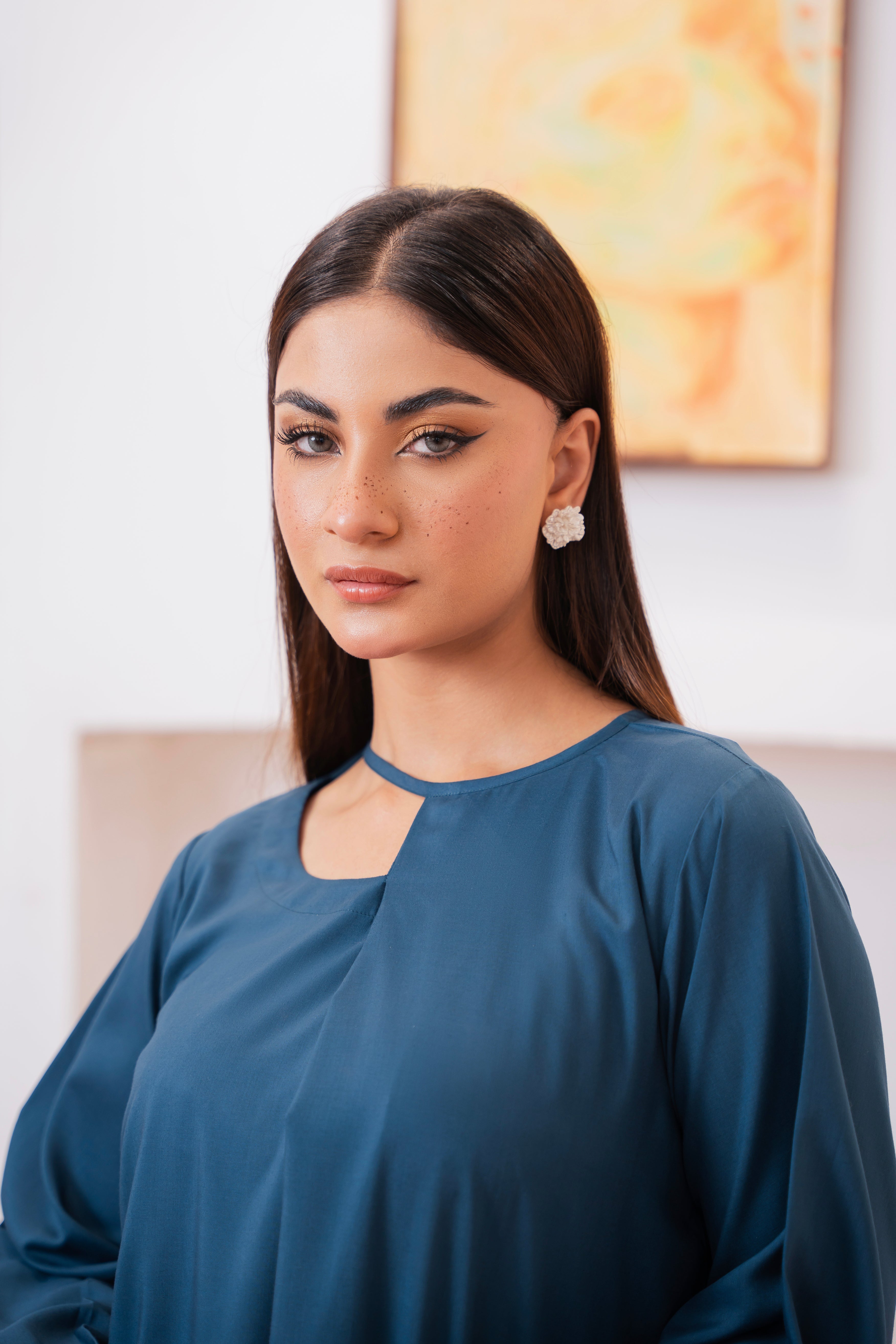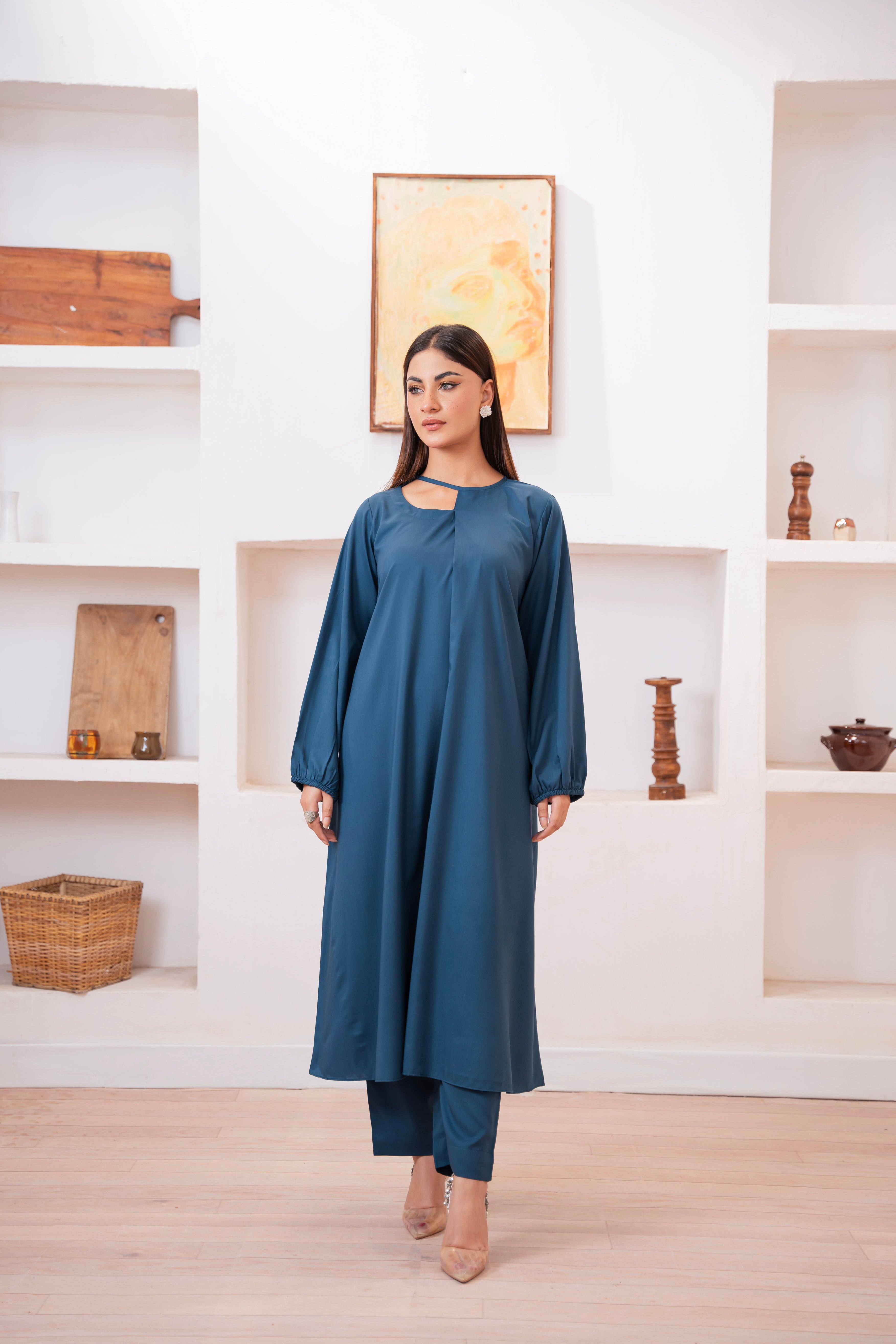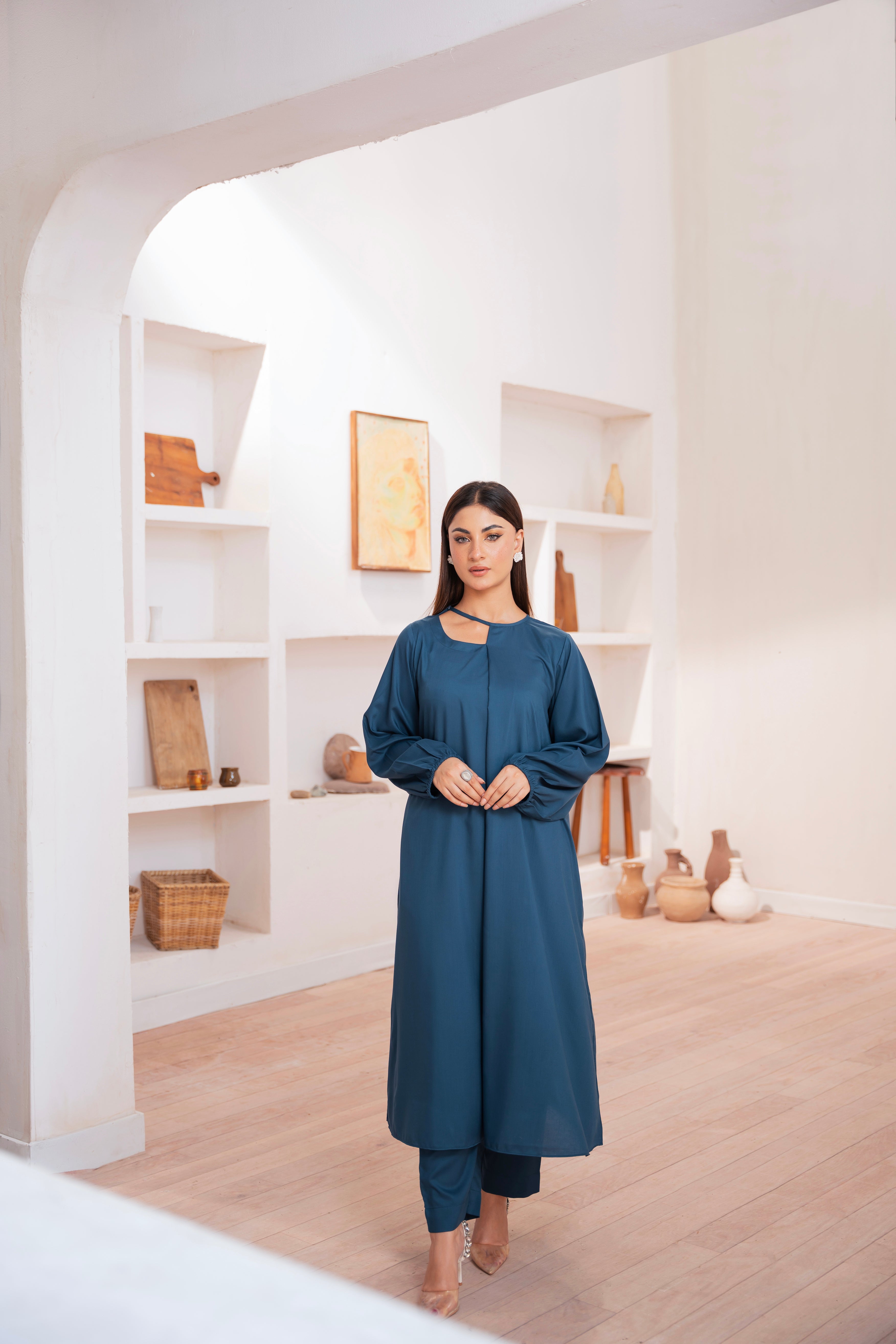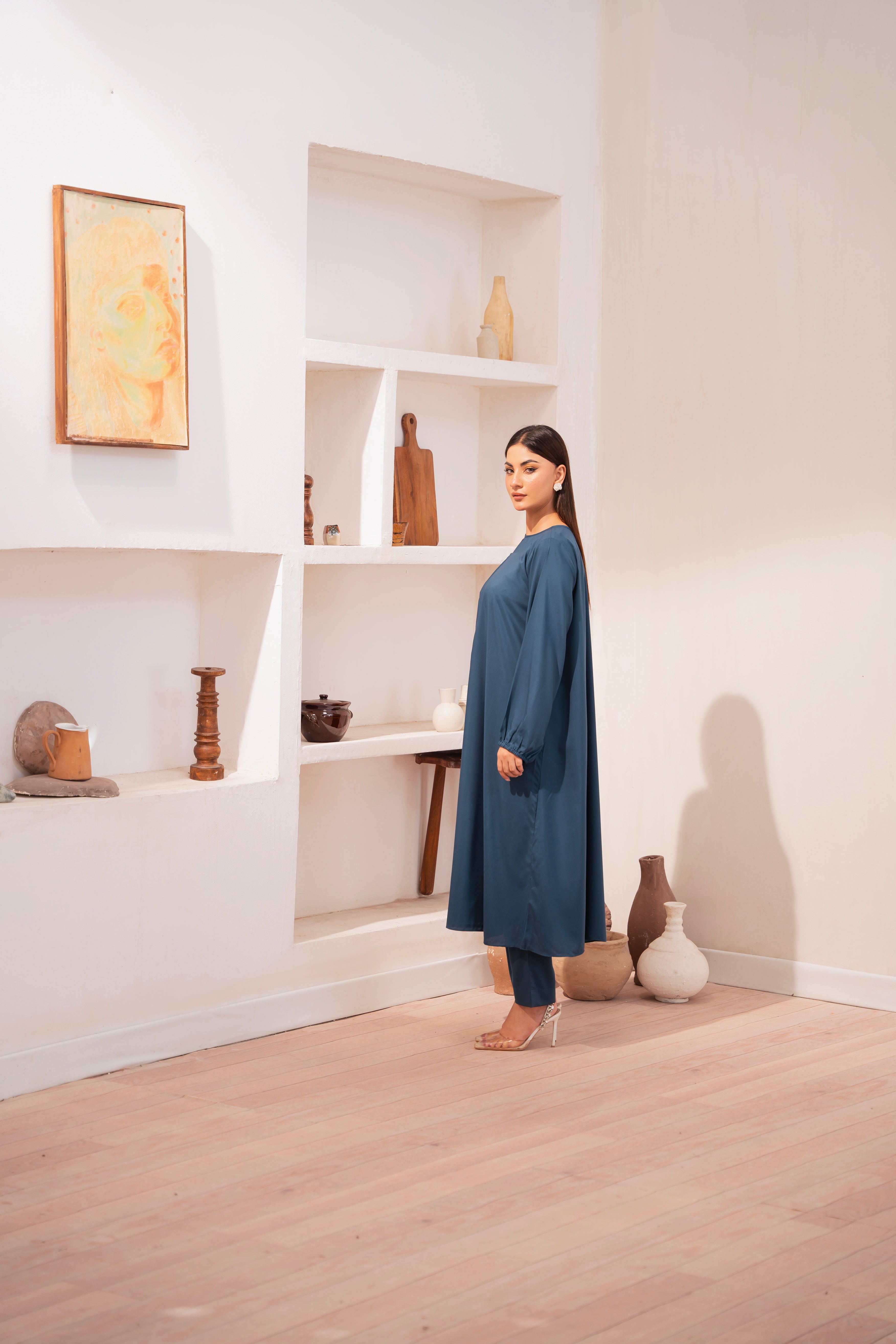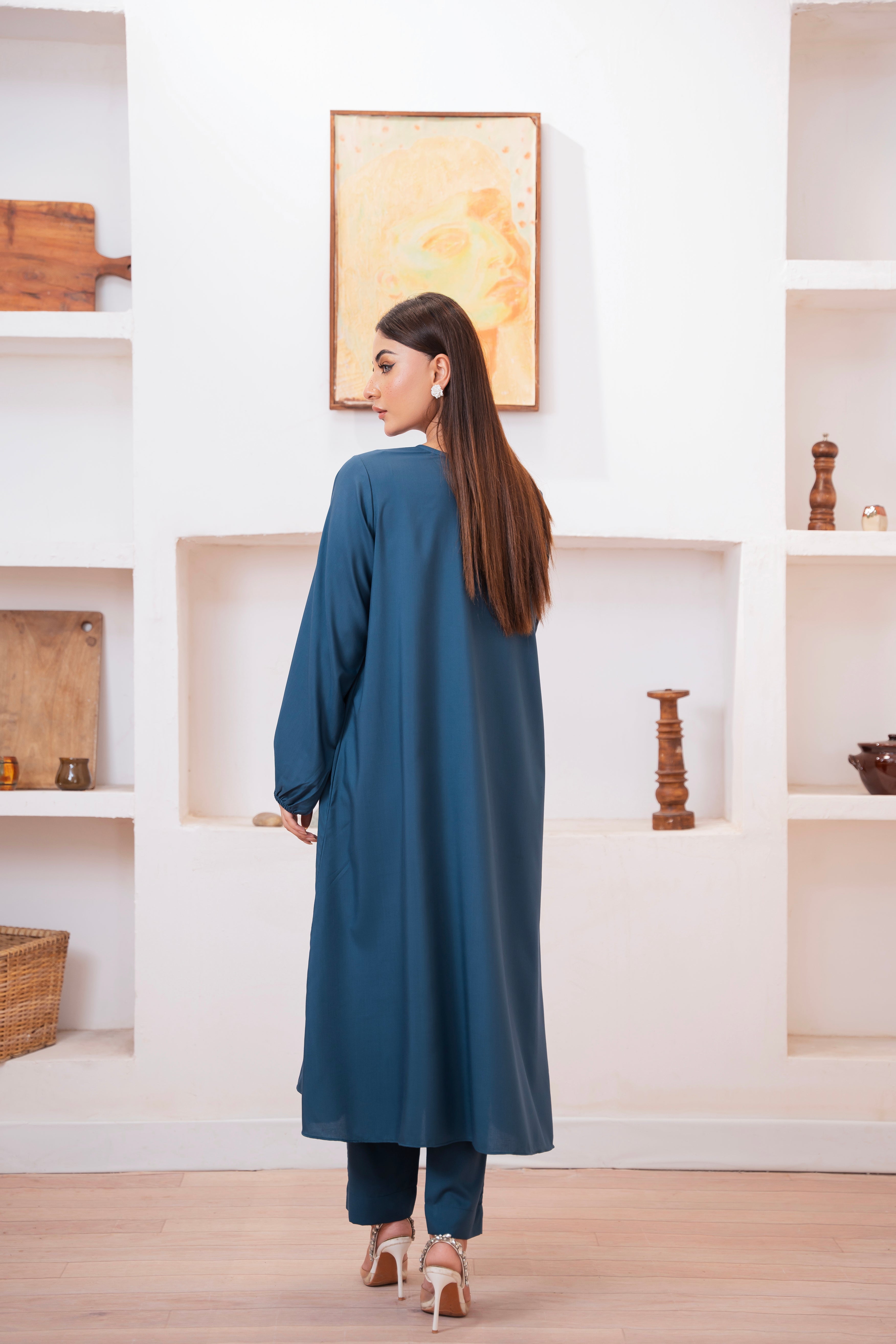 This two-piece dress includes a stylish frock and tailored trouser. This dress is crafted from our new soft crepe fabric, known for its sweat-absorbing properties, ensuring comfort throughout the day. Designed to blend contemporary Western styles with subtle traditional touches. The dress is shown here in size small, perfectly fitted on the model. Length of Shirt, Sleeve Opening & Shirttail are as per Design. Actual color may vary slightly from what appears on your screen due to lighting.