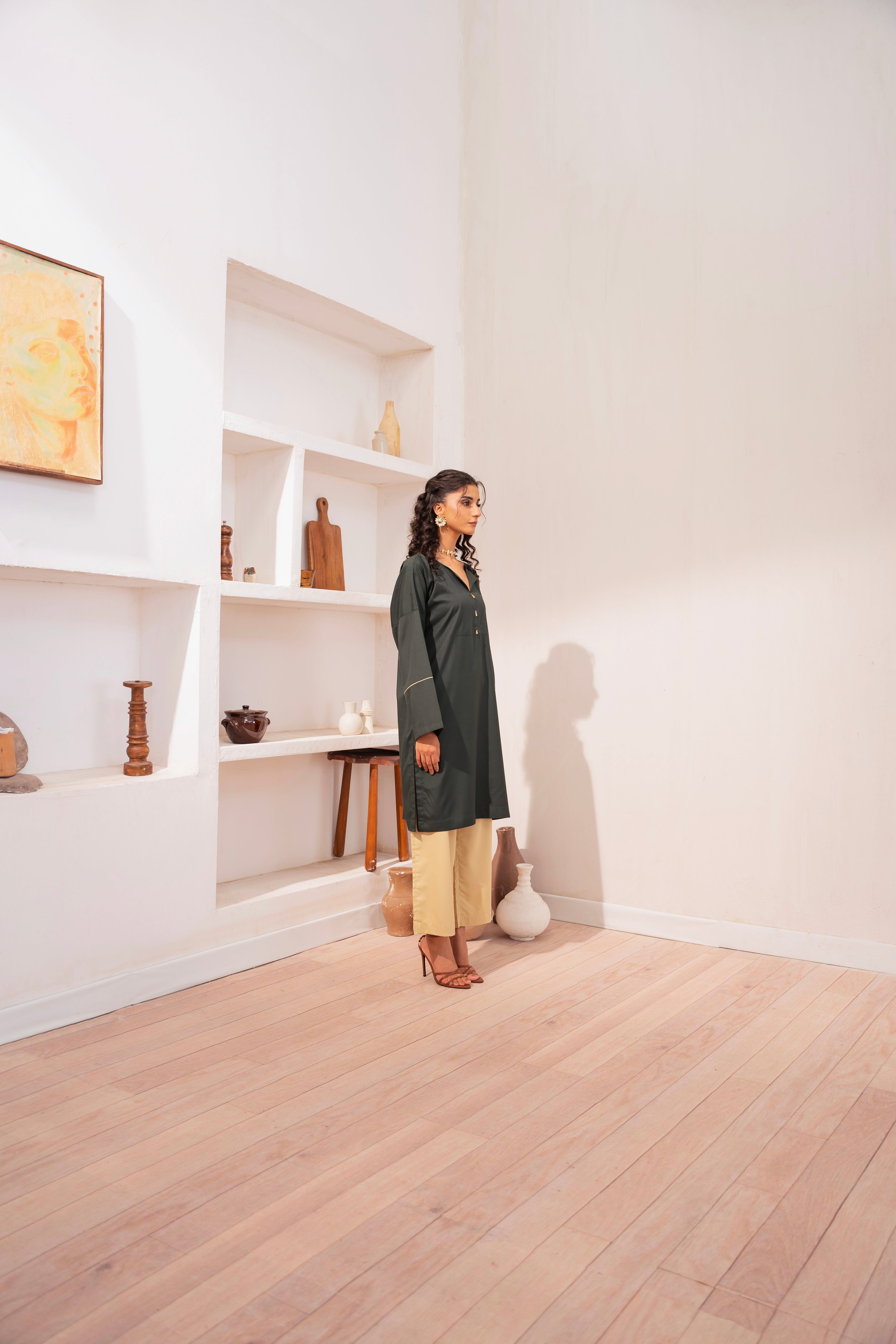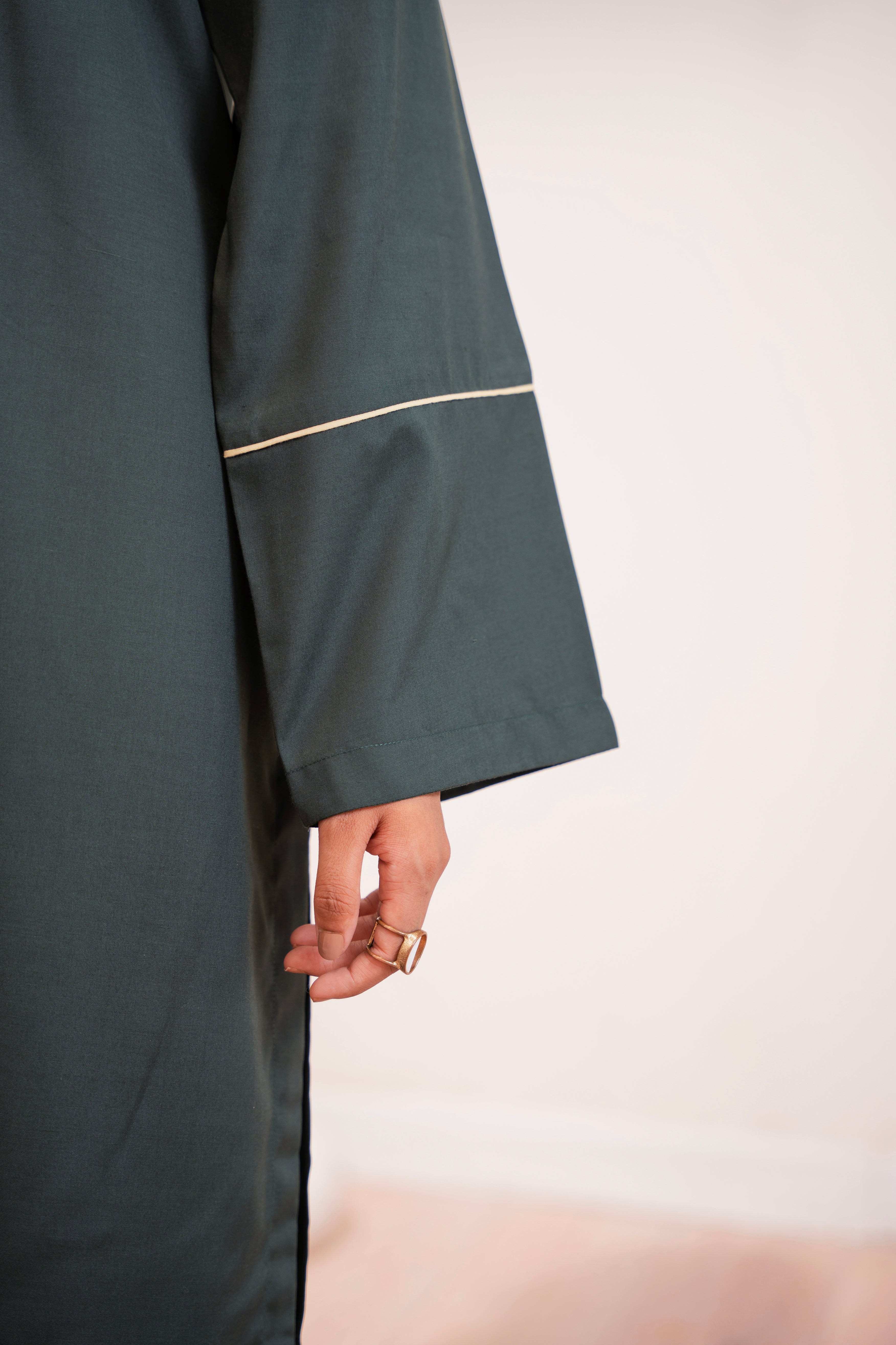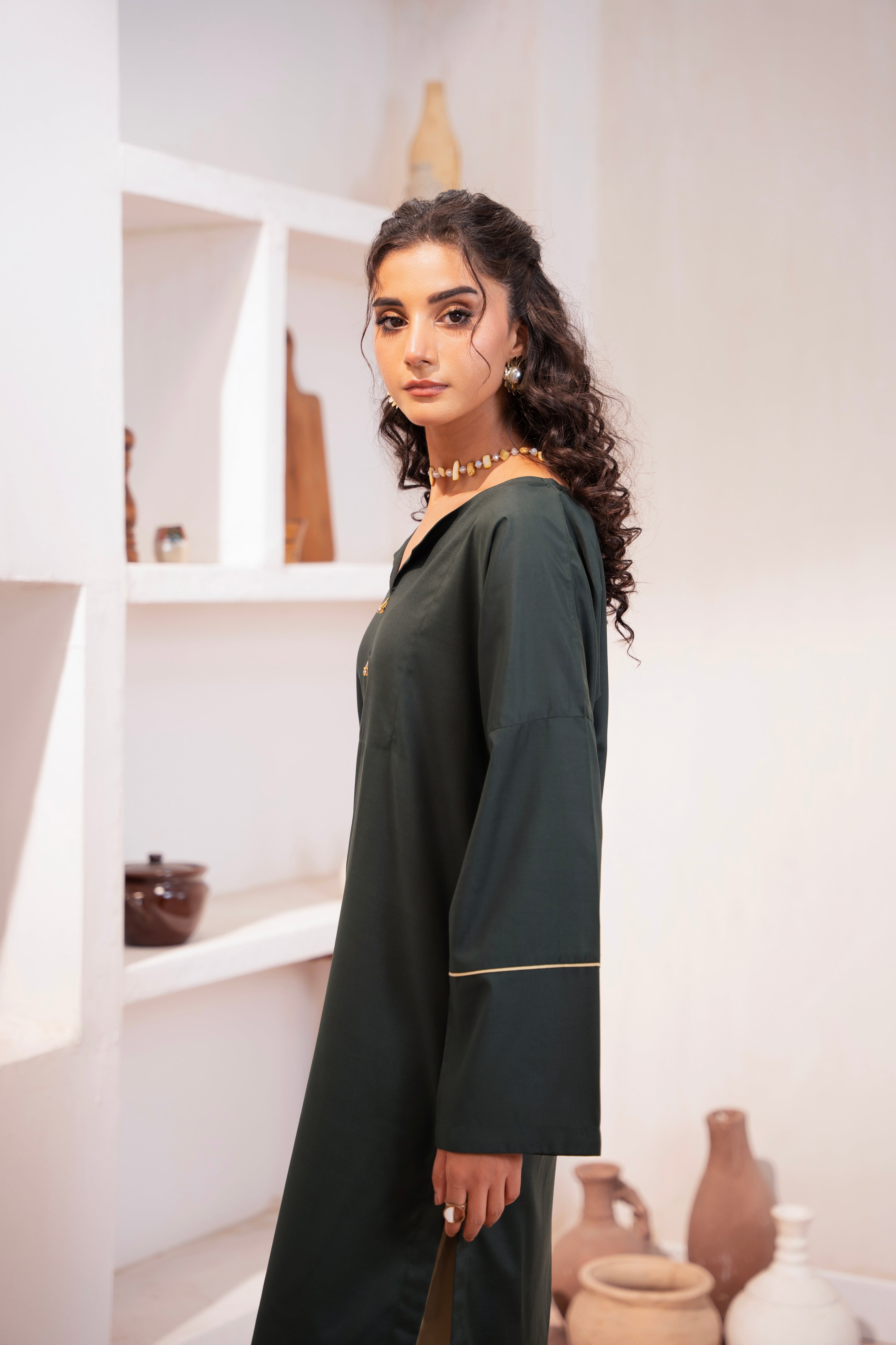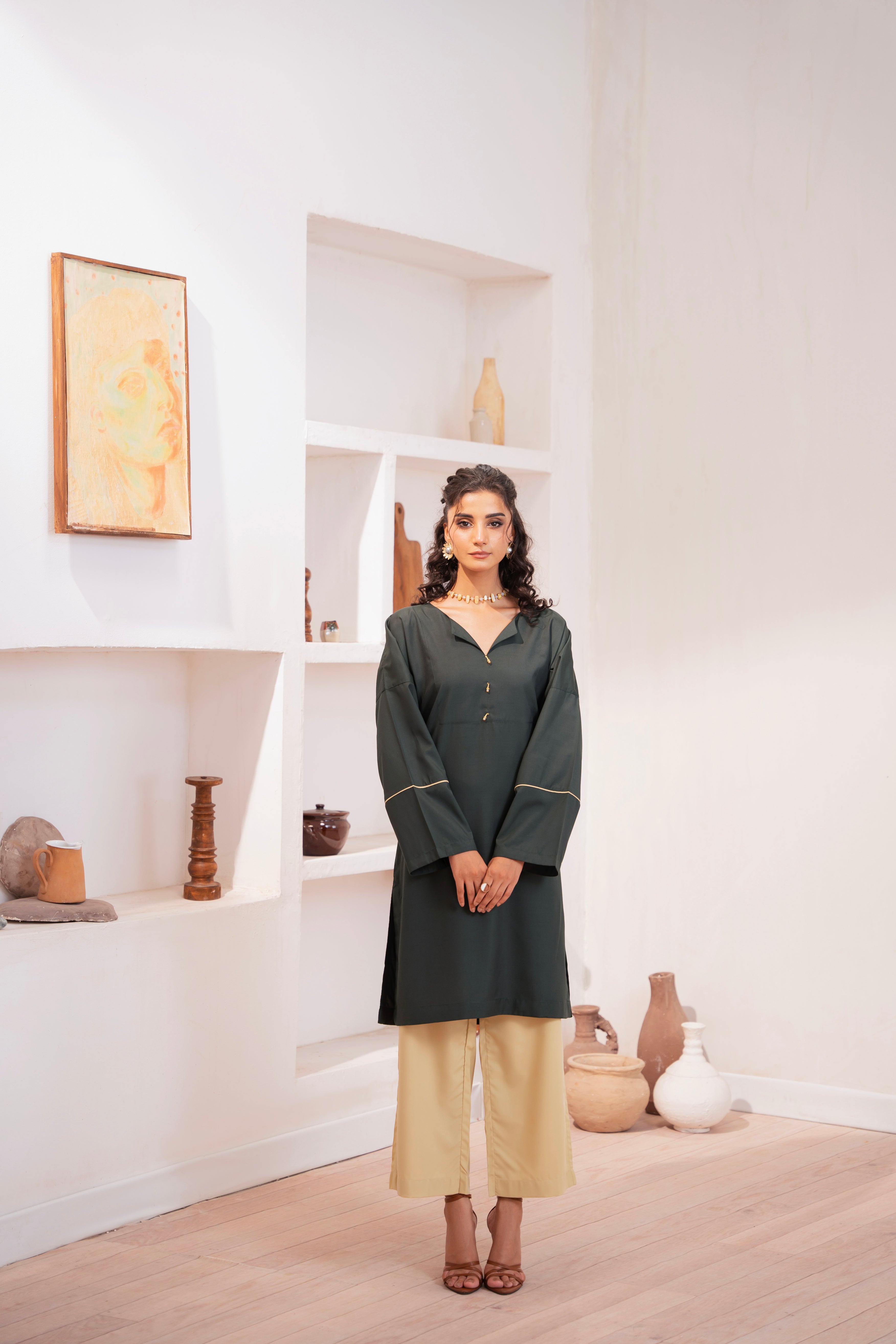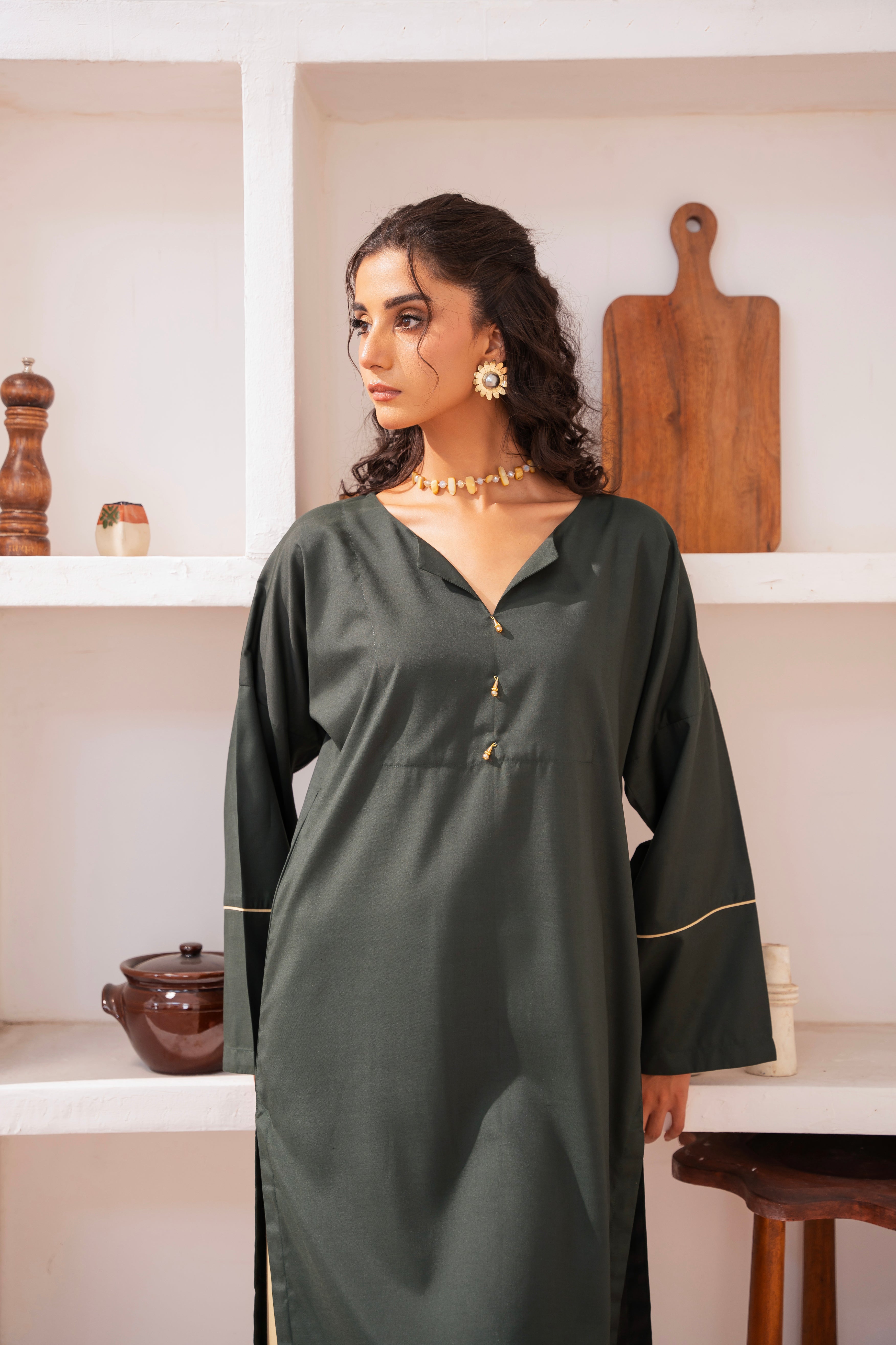 This two-piece dress includes a stylish frock and tailored trouser. This dress is crafted from our new soft crepe fabric, known for its sweat-absorbing properties, ensuring comfort throughout the day. Designed to blend contemporary Western styles with subtle traditional touches. The dress is shown here in size small, perfectly fitted on the model. Length of Shirt, Sleeve Opening & Shirttail are as per Design. Actual color may vary slightly from what appears on your screen due to lighting.