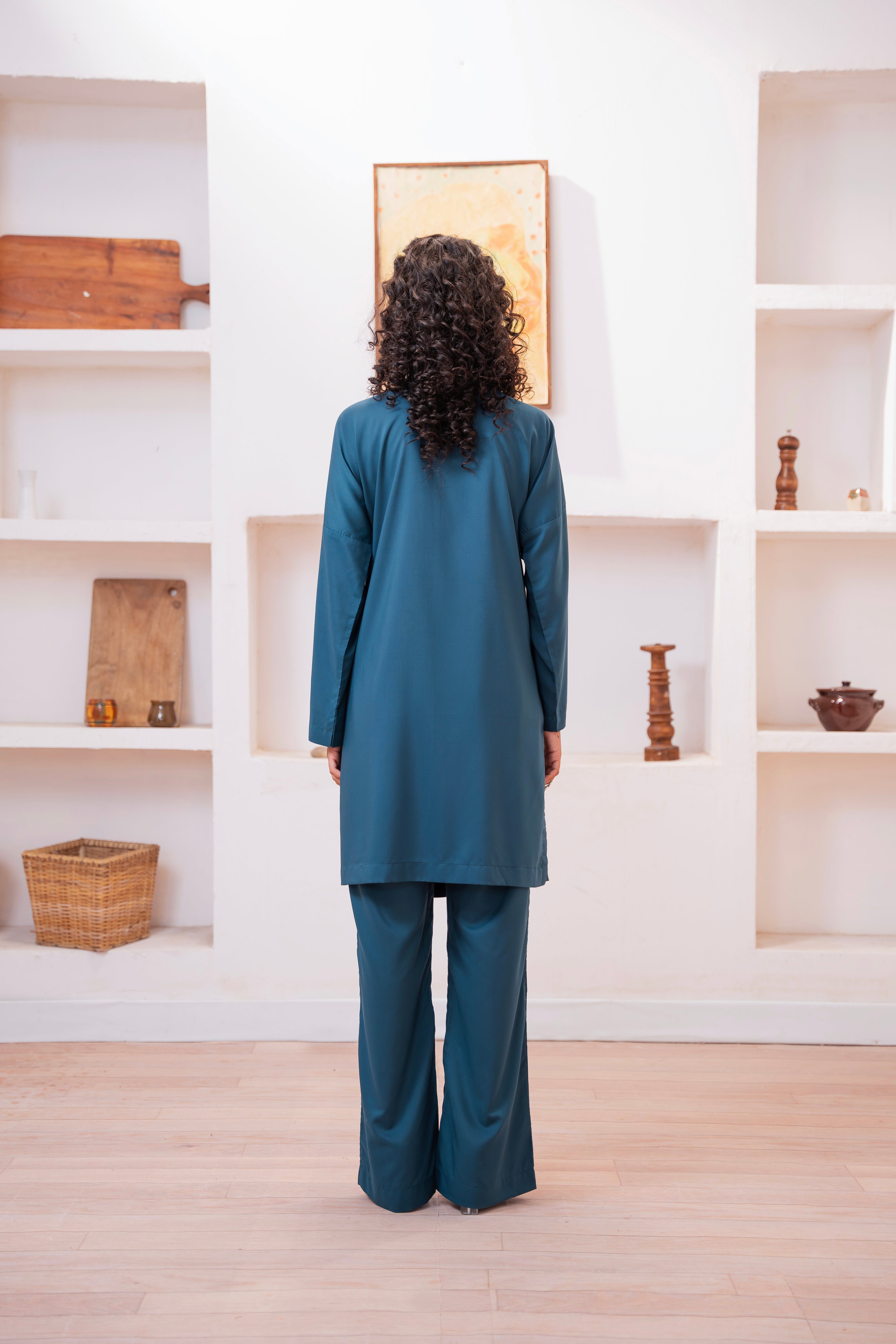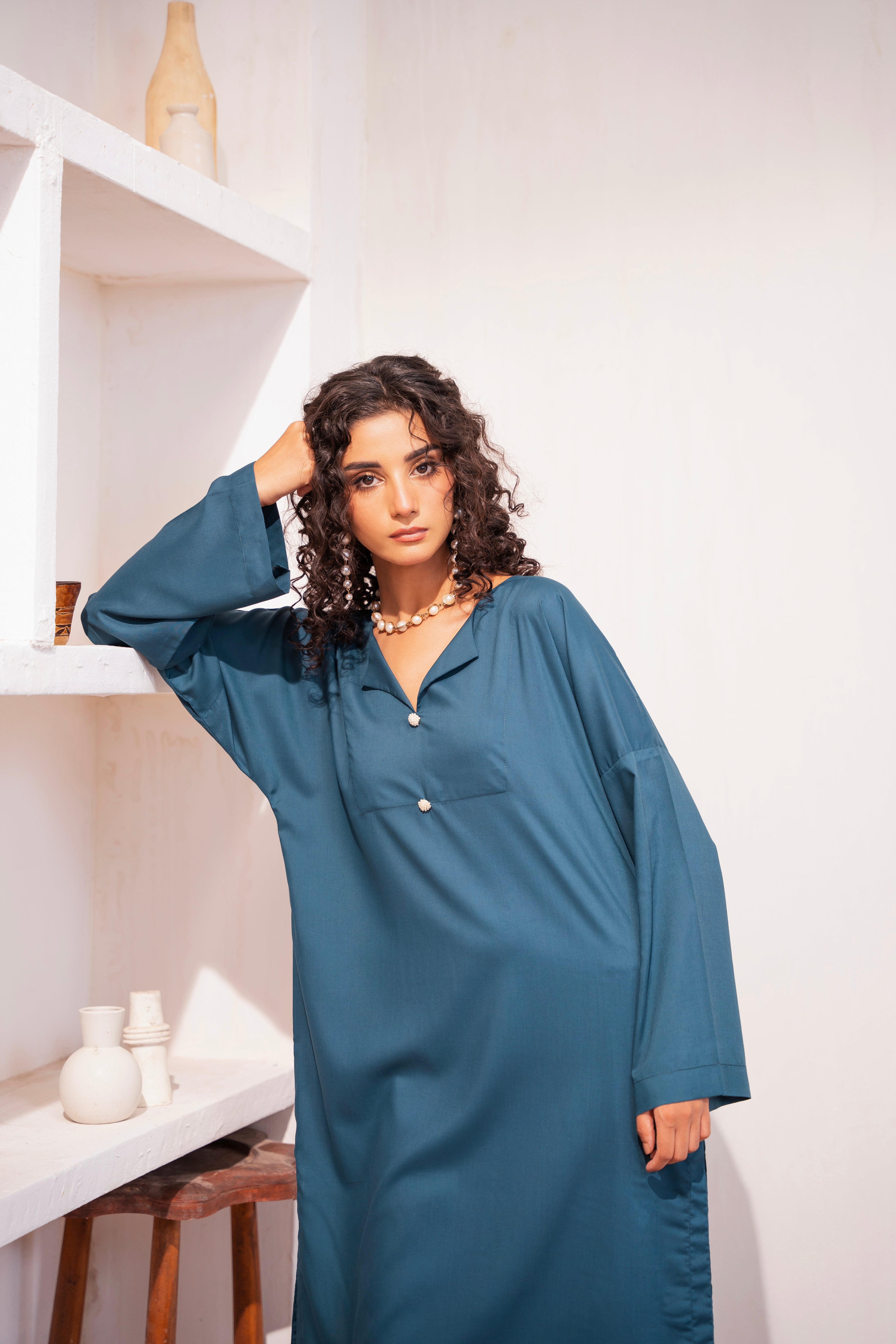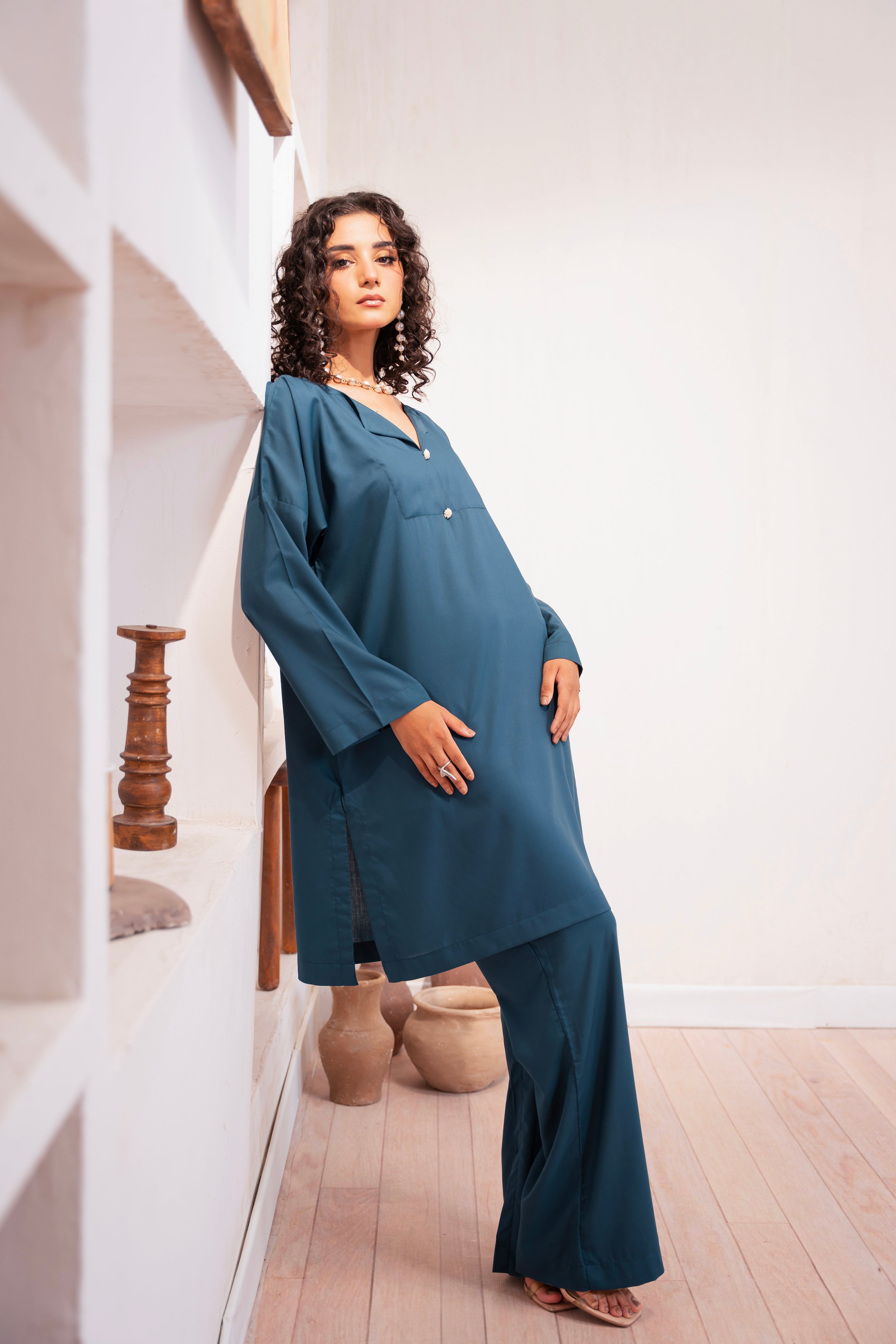This two-piece dress includes a stylish shirt and tailored trouser. This dress is crafted from our new soft crepe fabric, known for its sweat-absorbing properties, ensuring comfort throughout the day. Designed to blend contemporary Western styles with subtle traditional touches. The dress is shown here in size small, perfectly fitted on the model. Length of Shirt, Sleeve Opening & Shirttail are as per Design. Actual color may vary slightly from what appears on your screen due to lighting.